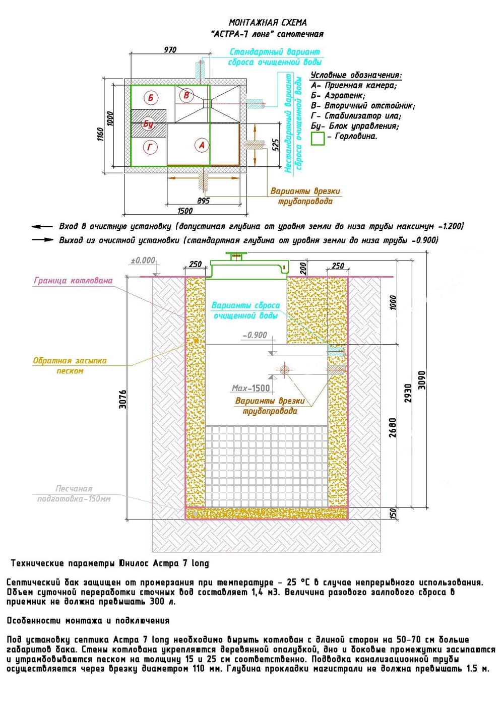 Лонг — высота станции 3,00 м. Врезка (вход трубы) до 1,50 м от уровня земли до нижнего края трубы.